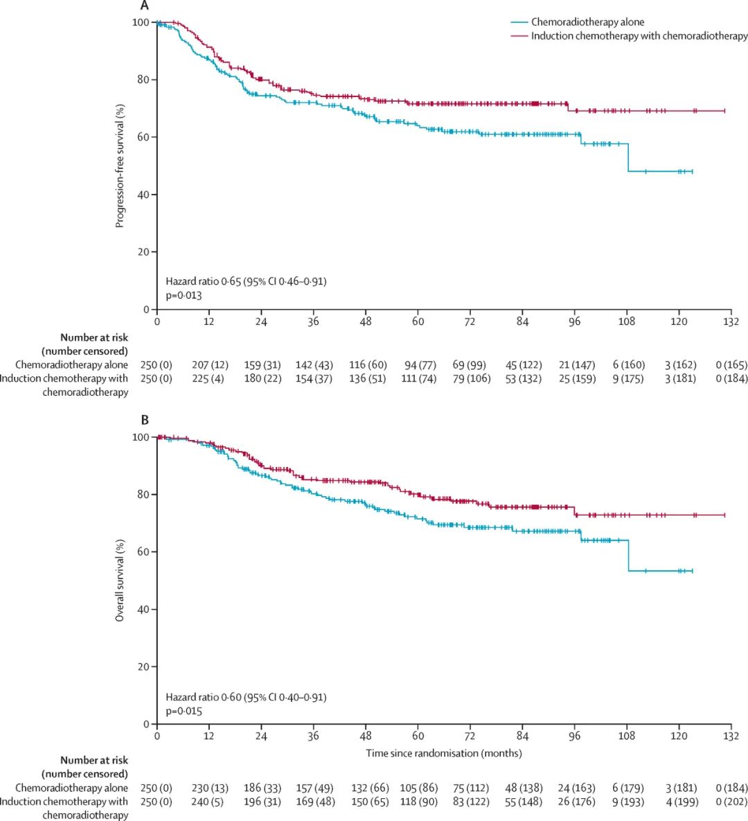 诱导化疗后进行放化疗显著提高了5年PFS率,从对照组的64%提高到72%(风险比<hr/>=0.65;95%CI,0.46-0.91;P=0.013)。