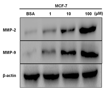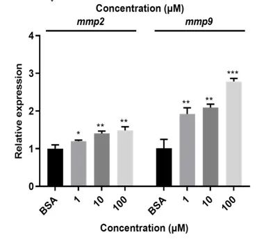 体内动物实验及体外功能实验表明,MASP6通过加速肿瘤侵袭和转移促进肿瘤进展。Western blot结果显示,经过48小时的MASP6处理后,乳腺癌细胞的基质金属蛋白酶(Matrix Metalloproteinase,MMP)MMP-2和MMP-9蛋白表达水平呈剂量依赖性增强,qRT-PCR同样揭示了mRNA表达水平的上调。