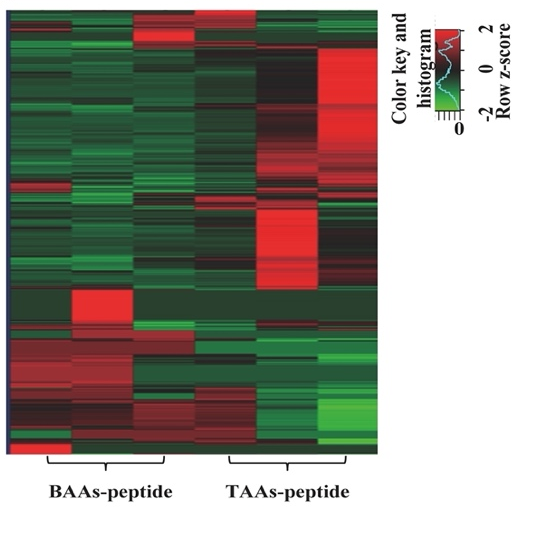 LC-MS/MS鉴定结果显示,共有1376种差异表达的多肽,其中来源于90种蛋白质前体的100条多肽,表现出显著的表达差异。其中35种多肽特异性表达于乳腺良性病变旁脂肪细胞,7条多肽特异性表达于乳腺癌旁脂肪细胞。