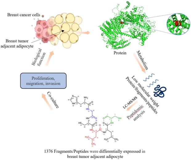 乳腺癌旁脂肪细胞与乳腺良性病变旁脂肪细胞的蛋白质降解肽组有显著差异,其中差异性多肽MASP6可加速肿瘤侵袭和转移促进乳腺癌进展,有望成为乳腺癌诊断的个体化生物标志物及潜在治疗靶标。