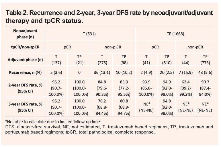 所有新辅助治疗的患者中,达到tpCR的患者的复发率为2.5%(3年DFS:94.9%),未达到tpCR的患者的复发率为5.6%(3年DFS:NE)。总体来说,达到tpCR的患者的复发率低于未达到tpCR的患者(见表2)。