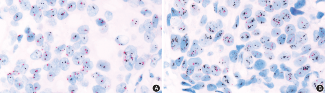 图3.浸润性乳腺癌HER2双色原位杂交检测结果DISH法高倍放大;A示阴性;B示阳性