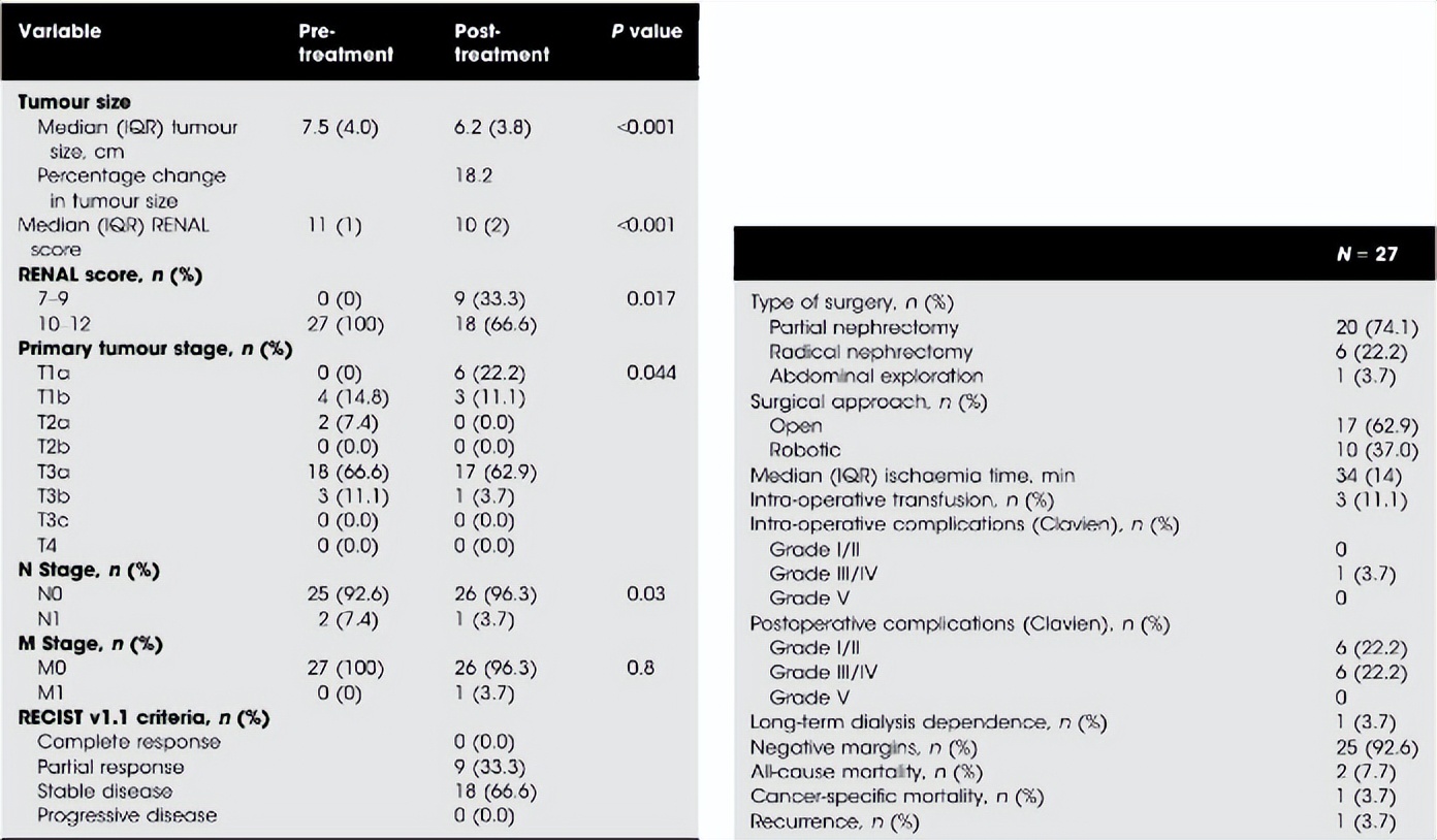 研究共纳入27例患者,中位年龄69岁。在接受治疗之前,20名患者(74.0%)肿瘤分期≥T3a。研究结果表明,阿昔替尼治疗可使肿瘤直径缩小(7.5 vs 6.2 cm;P<0.001),RENAL评分降低(11 vs 10;P<0.001)。根据RECIST评估,9名患者(33.3%)出现部分缓解,9名患者(33.3%)的临床分期降低。20名患者(74.0%)接受了部分肾切除术;25名患者(96.2%)为阴性切缘[1]。结果证实,新辅助治疗能够使复杂肾肿瘤的患者安全、可行地进行部分肾切除术。