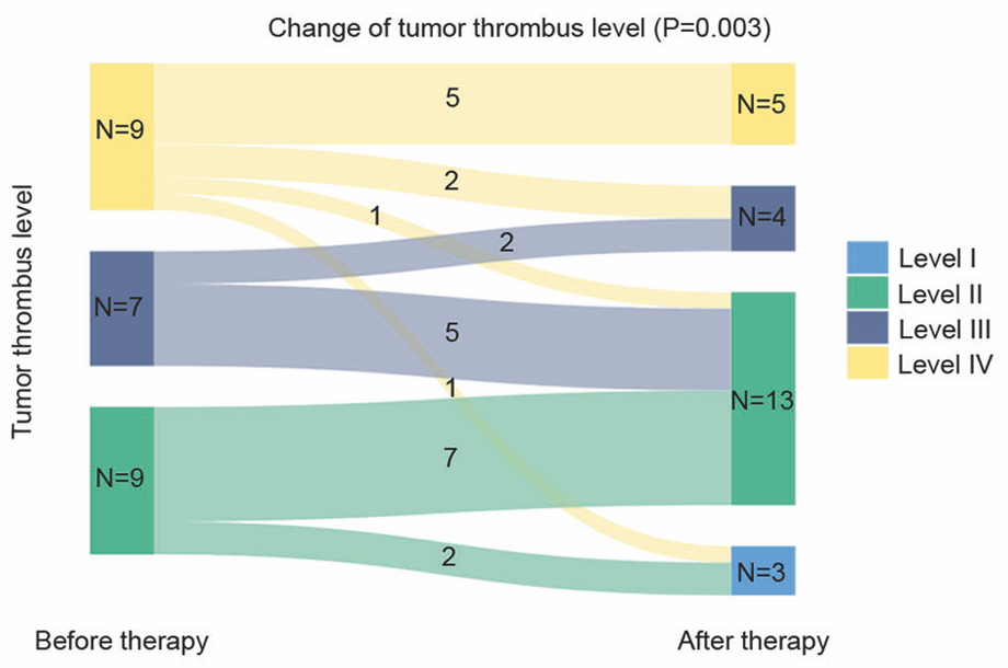 研究共入组25例患者,结果显示,在25例接受治疗的患者中,有11例(44.0%)患者的癌栓降级,中位癌栓高度降低2.3cm。21例患者顺利完成了手术,其中13例患者的手术策略因癌栓高度的降低而得到了调整,手术决策改变比为61.9%(13/21),简化了手术过程。在随访过程中,研究者观察到1年无进展生存率高达89.1%,展示了新辅助治疗在改善患者短期预后方面的潜力;部分患者的2年PFS结果并未达到理想预期,可能与患者初始疾病分期较高有关。这些结果提示,对于II级以上的癌栓患者,术前新辅助治疗可作为一种降低癌栓高度、优化手术条件的策略。