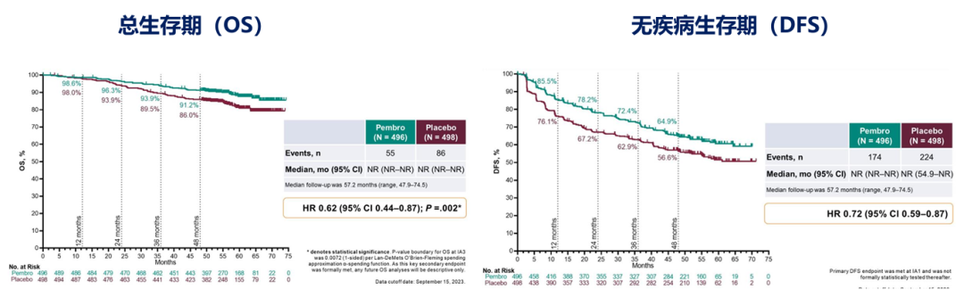 这项双盲、随机、安慰剂对照的III期临床研究,纳入年龄≥18岁、ECOG PS评分为0或1、随机分组前≤12周行肾切除术和/或转移切除术、疾病复发风险增加的肾细胞癌患者,主要终点是DFS,关键次要终点为OS。共入组994名患者,DFS结果与既往一致。OS结果显示,相较于安慰剂,帕博利珠单抗治疗可降低38%的患者死亡风险(HR 0.62,P=0.005)。帕博利珠单抗组的48个月OS率91.2%,高于安慰剂组的86.0%。各主要亚组获益一致。因此,对于局部RCC,尤其是中高危患者,肾切除术后的帕博利珠单抗等辅助治疗可成为一种新的治疗选择。