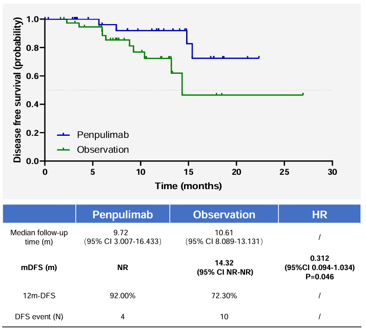 △派安普利单抗辅助治疗极高危ccRCC的DFS分析