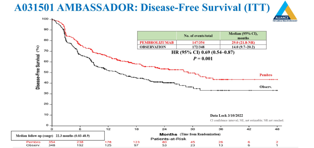 AMBASSADOR研究是另一个ICI辅助治疗MIBC的III期研究。该研究入组患者为新辅助化疗后≥pT2和/或pN+/切缘阳性,以及不适合或拒绝新辅助化疗的≥pT3和/或pN+/切缘阳性患者,术后接受帕博利珠单抗或安慰剂辅助治疗1年。2024年ASCO-GU大会报道达到了研究的主要终点之一DFS:帕博利珠单抗组和对照组的中位DFS分别为29.0个月和14.0个月(HR 0.69,95%CI 0.54~0.87,P=0.001)。但另一个主要终点OS尚无显著差异(50.9 vs 55.8个月,HR 0.98,95%CI:0.76~1.26;P=0.883)[10]。