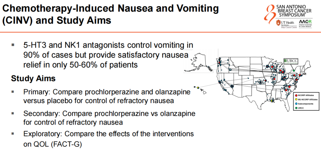 Luke Peppone教授:许多接受化疗的乳腺癌患者都有恶心和呕吐的经历。我们目前使用的药物在控制呕吐方面非常有效,能够减少90%以上的呕吐。然而,对于恶心的控制效果则相对较差,改善幅度约为50%。这是因为恶心是一个更为复杂的症状,呕吐集中在大脑的一个特定区域,而恶心则涉及多个区域。因此,尽管呕吐得到了有效控制,患者仍然会感到恶心,这种不适感显然非常困扰患者。我们有两种药物,在美国早已获批,且我们对它们的使用经验丰富。我们了解它们的安全性,药物本身也相对安全,而且对于患者群体来说,价格较为亲民,供应也很充足,市场上有大量仿制药可供选择。因此,这些药物非常容易获得,这也是我们进行这项研究的一个重要原因。