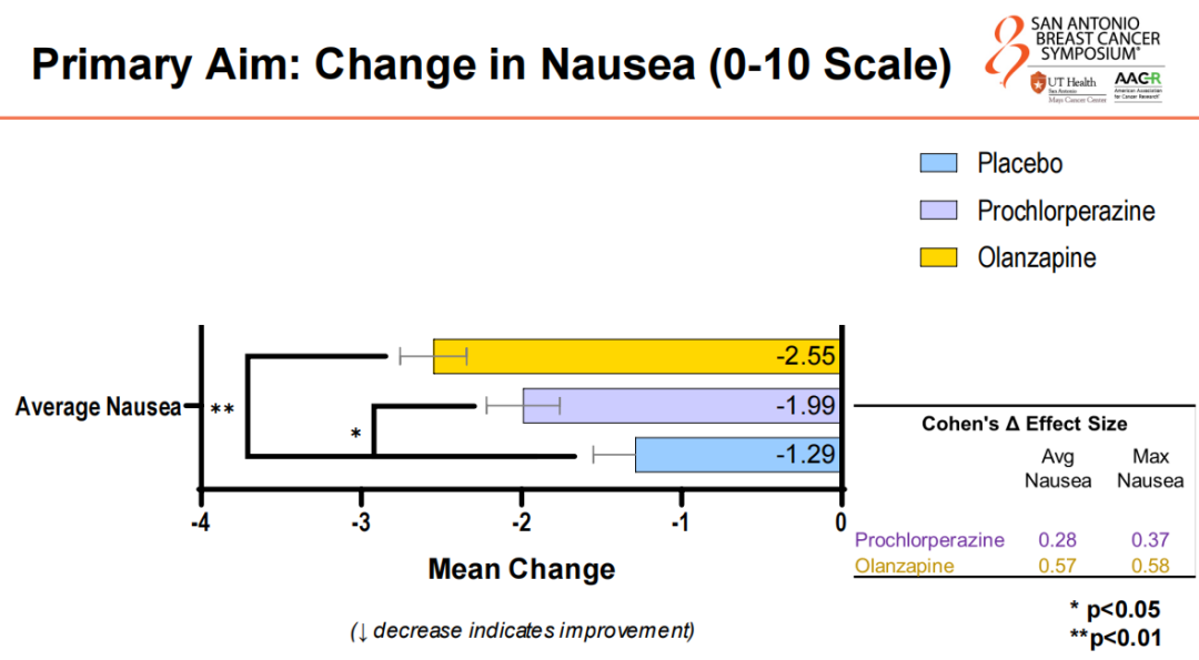 Prof.Luke Peppone:So in terms of safety profile,both of those drugs were excellent,and we had no serious adverse events related to the study intervention drugs,either olanzapine or prochlorperazine.We had a number of adverse events that were all expected.Olanzapine is known to cause sedation and some drowsiness,and those were the typical adverse events that we dealt with,similar with prochlorperazine,but nothing unexpected.And adverse events between the placebo and the study interventions were very similar.We’re still teasing apart those,but the safety profile of those two drugs in our study and in previous research are excellent,and that’s one of the many reasons why they were chosen,and we like using these drugs in these patients.