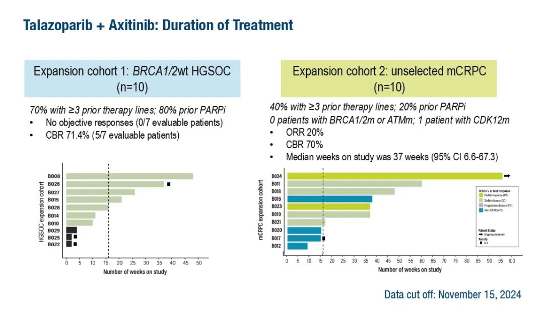 这些队列所有患者既往经过重度治疗(多数曾使用PARP抑制剂),起始剂量均为他拉唑帕利1 mg联合阿昔替尼5 mg,截至数据分析时仍有1例在组。生物标志物与药代动力学分析正在进行中。