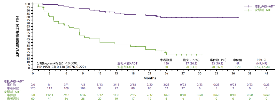 △聚焦于中国mHSPC患者的多中心III期临床研究China ARCHES:恩扎卢胺+ADT可相较于ADT显著提高患者达到PSA不可检测水平的比例(76.3%vs 22.8%)。[3]