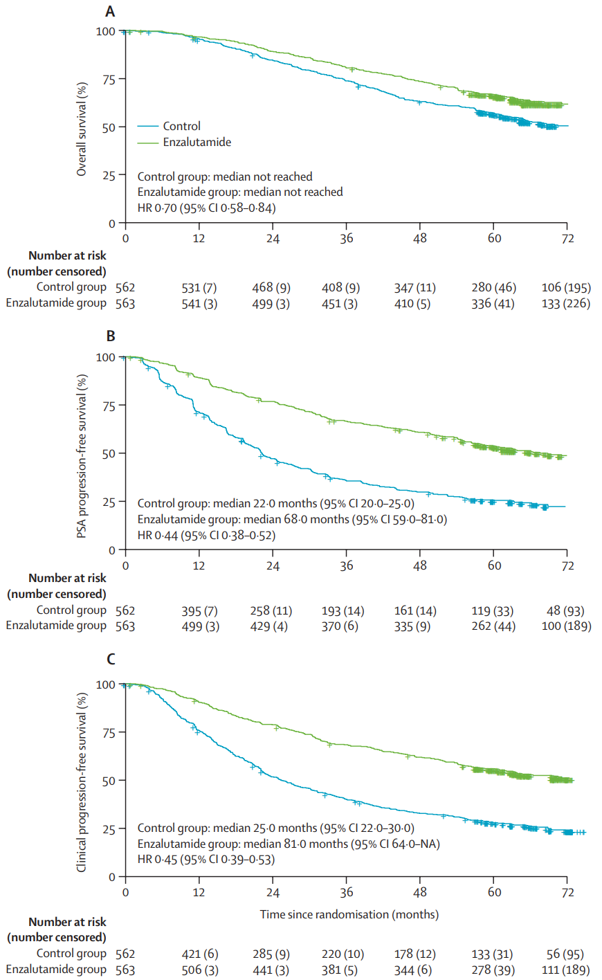 [1]Sweeney,Christopher J.,et al."Testosterone suppression plus enzalutamide versus testosterone suppression plus standard antiandrogen therapy for metastatic hormone-sensitive prostate cancer(ENZAMET):an international,open-label,randomised,phase 3 trial."The Lancet Oncology 24.4(2023):323-334.