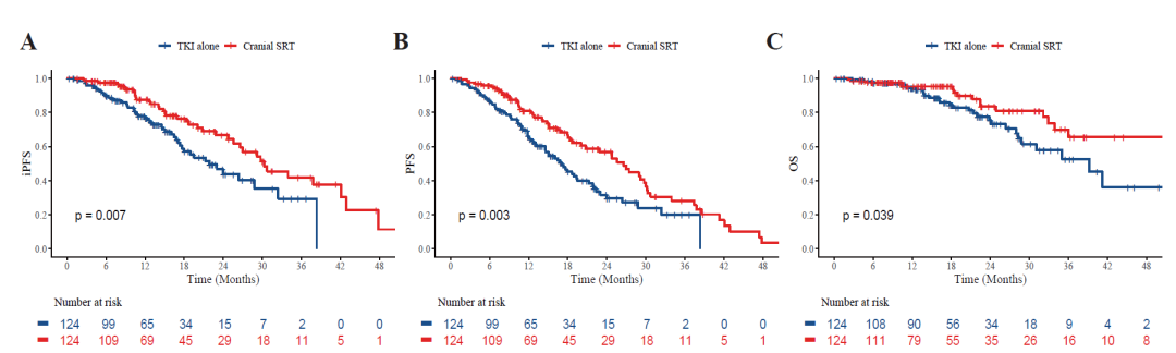 本研究共纳入400例患者,其中134例(33.5%)接受了eSRT(同步82例,巩固52例)。PSM匹配后,eSRT组的iPFS(30.3 vs.21.9个月,p=0.007)、PFS(26.6 vs.17.1个月,p=0.003)及OS(未达到vs.39.2个月,p=0.039)均显著优于单纯TKI组(均P<0.05)。