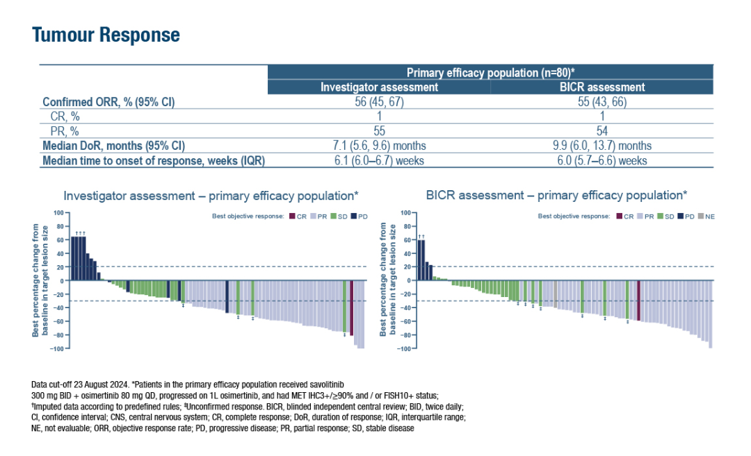 图1:SAVANNAH试验中二线赛沃替尼+奥希替尼在奥希替尼治疗后进展的EGFR突变NSCLC伴MET过表达/扩增患者中展现出良好疗效(摘要号2O)