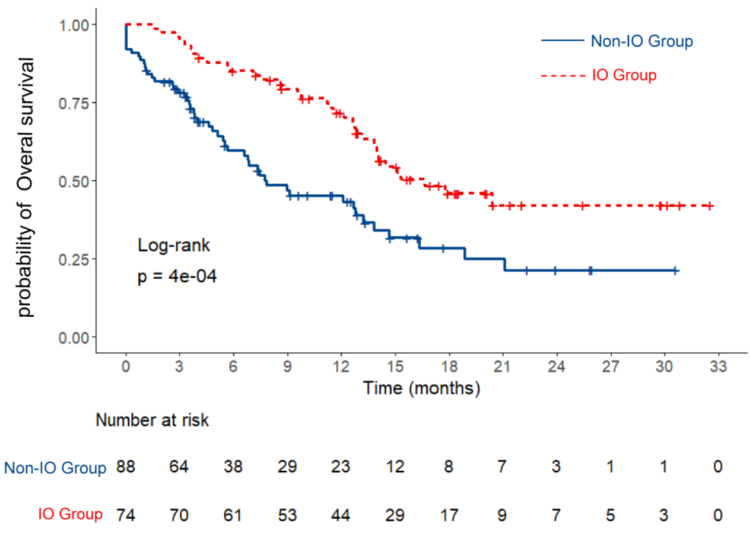 对ORIENT-31试验中化疗组162名患者分析发现,74名患者在化疗治疗进展后接受了免疫交叉治疗(IO组),而88名未接受免疫治疗(非IO组)。