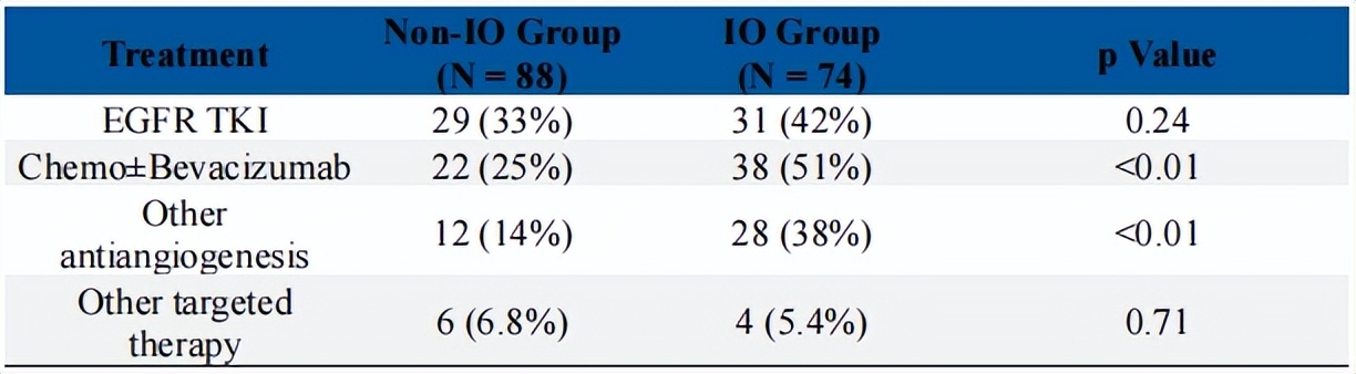 在EGFR-TKI耐药患者化疗治疗进展后,IO组和非IO组在治疗方案的选择上存在显著差异(表1)。接受EGFR-TKI治疗的比例在IO组中和非IO组中分别为42%和33%;接受化疗±贝伐珠单抗的比例在IO组为51%,显著高于非IO组的25%;接受其他抗血管生成治疗的比例在IO组为38%,也高于非IO组的14%,显示后线的免疫治疗更多和抗血管生成联合使用。