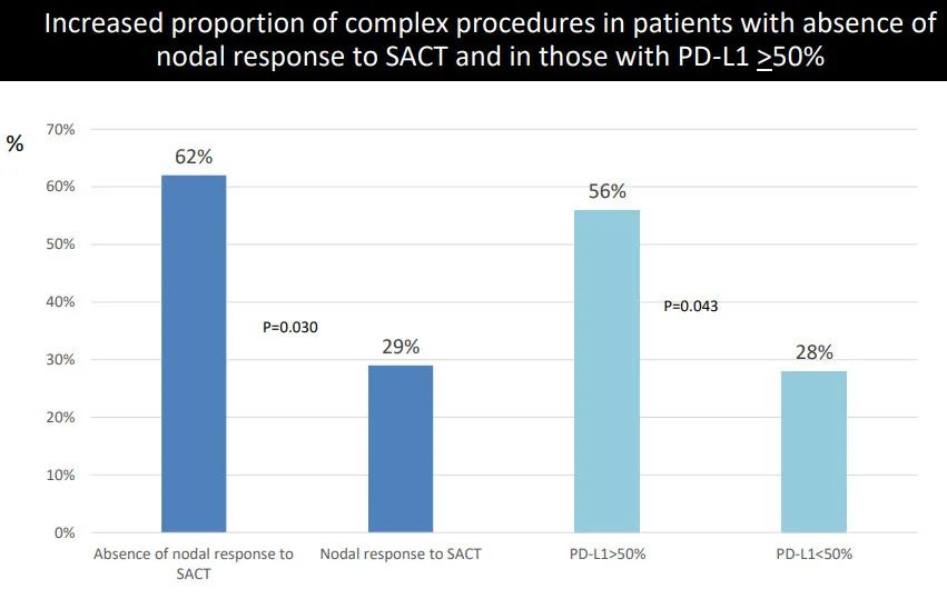 无淋巴结缓解与手术复杂性相关(无淋巴结缓解者中手术复杂率为62%,缓解者中复杂率为29%,p=0.030)。56%的PD-L1表达≥50%患者接受了复杂手术(vs.PD-L1<50%患者28%)。