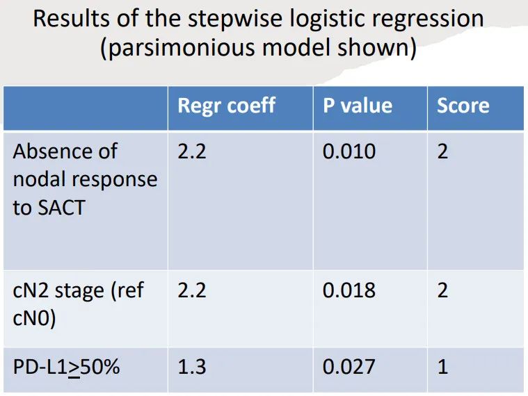 logistic回归分析后,以下变量与复杂性显著相关:无淋巴结缓解(Coeff 2.2,p=0.010,评分=2)、cN2分期(Coeff 2.2,p=0.018,评分=2),PD-L1≥50%(Coeff 1.3,p=0.027,评分=1)。
