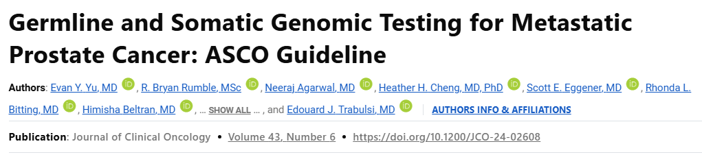 Yu E Y,Rumble R B,Agarwal N,et al.Germline and Somatic Genomic Testing for Metastatic Prostate Cancer:ASCO Guideline[J].Journal of Clinical Oncology,2025:JCO-24-02608.