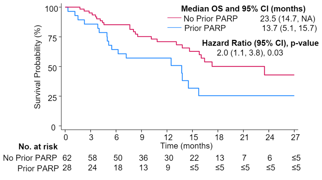 在接受T-DXd治疗的BRCA突变患者中,PARPi经治患者与未经治患者的rwPFS相似(7.2 vs 7.8个月,HR 1.1,P=0.71),但PARPi经治患者的OS显著更短(13.7 vs 23.5个月,HR 2.0,P=0.02)。