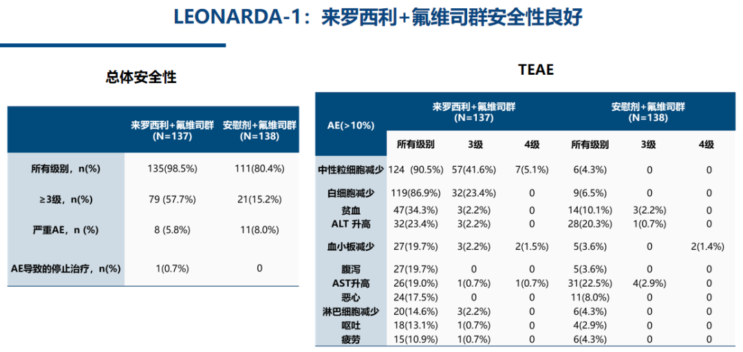 安全性方面,来罗西利组≥3级不良事件发生率为57.7%,4级中性粒细胞减少比例仅为5.1%,腹泻发生率为19.7%,无3级及以上腹泻发生。此外,来罗西利组较安慰剂组未增加肝毒性、Q-T间期延长、皮疹、静脉血栓等发生风险;AE导致的停止治疗仅为0.7%,安全性更高。
