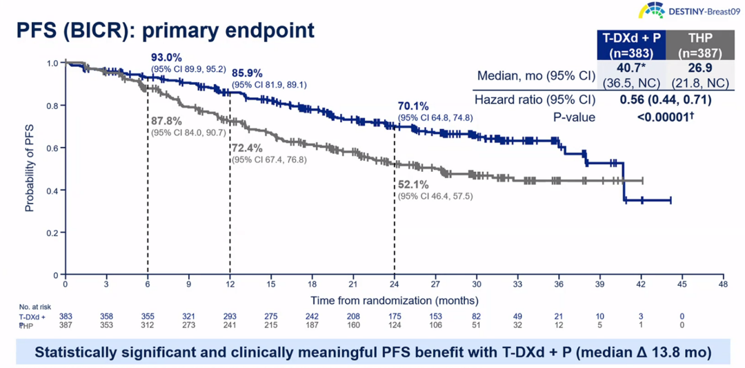 纵览乳腺癌抗HER2治疗发展史,从单靶治疗发展到双靶治疗,而双靶治疗已经有十几年的历史,并且成为非常经典且重要的治疗方式。而如今,这一“经典”可能面临改变,大家都十分关注T-DXd联合帕妥珠单抗(T-DXd+P)或者单独使用T-DXd,能否超越现有的标准一线治疗THP方案(紫杉+曲妥珠单抗+帕妥珠单抗)。根据目前的随访结果,DB-09研究达到了主要研究终点,盲态独立评审中心(BIRC)评估T-DXd+P的中位PFS显著长于THP(40.7 vs 26.9个月;HR 0.56,95%CI:0.44~0.71,P<0.00001)。
