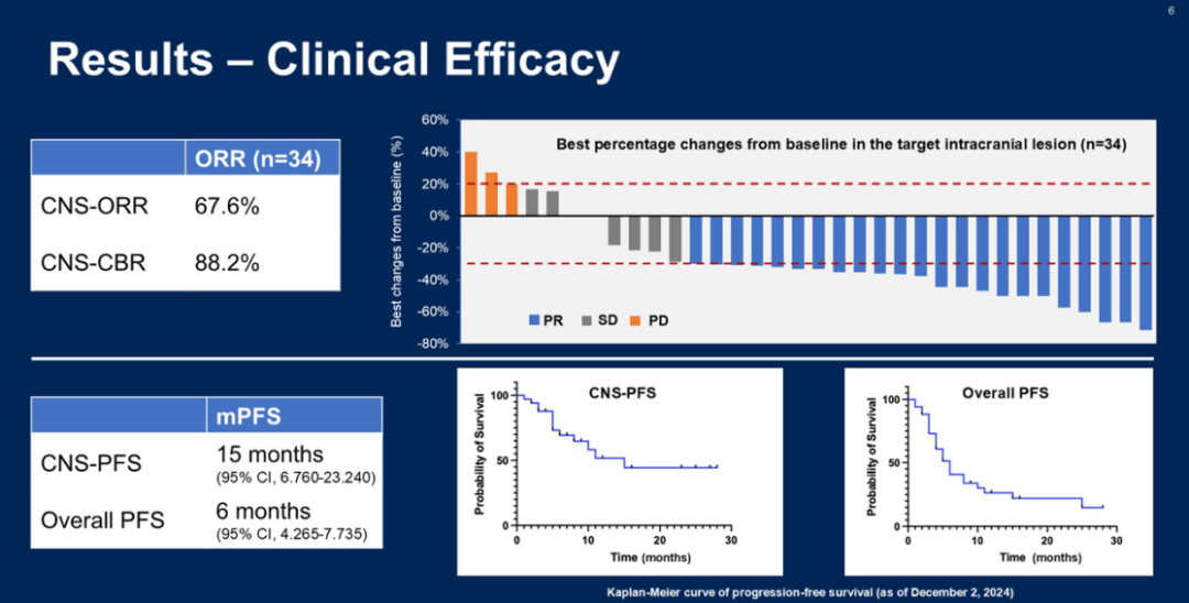 本次大会上,我报道了该研究的中期分析结果。该研究入组的34例患者中,包括11例三阴性乳腺癌患者和23例Luminal型乳腺癌患者。中位年龄为52岁(范围34-74岁),中位治疗线数为3线。截至2024年12月2日,中位随访时间为11.5个月,中枢神经系统客观缓解率(CNS-ORR)达到了67.6%,中枢神经系统临床获益率(CNS-CBR)达到了88.2%。此外,我们还观察到了患者的生存获益,中位无进展生存期(PFS)为6个月(95%CI:4.265-7.735个月),而中枢神经系统无进展生存期(CNS-PFS)达到了15个月(95%CI:6.760-23.240个月),CNS-PFS实践显著长于中位PFS时间,为患者提供了更好的治疗选择。