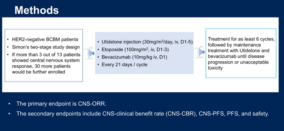 史业辉教授:目前,乳腺癌引起的脑转移是第二大常见的颅内转移,仅次于肺癌引起的脑转移。且与可从多种抗HER2治疗中获益的HER2阳性乳腺癌相比,伴有脑转移的HER2阴性乳腺癌患者的治疗选择有限。此外,由于血脑屏障(BBB)的存在,全身治疗未能产生令人满意的效果,当前各项指南未对HER2阴性乳腺癌脑转移患者给出全身给药方案推荐。优替德隆可以穿透血脑屏障,这一点已通过临床前药物组织分布研究和多项临床试验得到证实。因此,我们设计了优替德隆联合依托泊苷和贝伐珠单抗治疗HER2阴性脑转移患者的II期前瞻性单臂研究,以探索优替德隆联合依托泊苷和贝伐珠单抗的三药联合方案,在HER2阴性脑转移乳腺癌患者治疗的有效性和安全性。