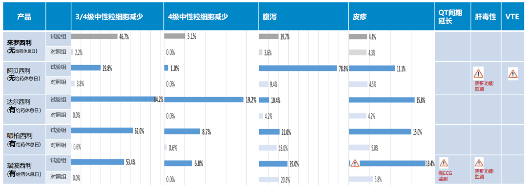 LEONARDA-1研究进一步验证了上述药物机制优势,最为突出的优势是血液毒性、腹泻发生率低;4级中性粒细胞减少症发生率仅为5.1%,胃肠道毒性低,无≥3级腹泻[5],极大提高了患者长期治疗的依从性,提升了生活质量及户外活动的可行性。此外,LEONARDA-1研究中,来罗西利治疗患者没有发生QT间期延长、肝毒性、VTE(静脉血栓栓塞症)、肺部ILD等特殊不良事件,治疗期间无需进行心、肺、凝血等监测,有助于节省患者医疗费用。