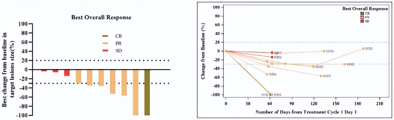 在10例可评估疗效的患者中,ORR高达70%,DCR为100%。首次肿瘤疗效评估时,40%的患者肿瘤缩小超过30%,1例达到完全缓解(CR)。截至2025年1月23日,仅1例患者出现疾病进展。