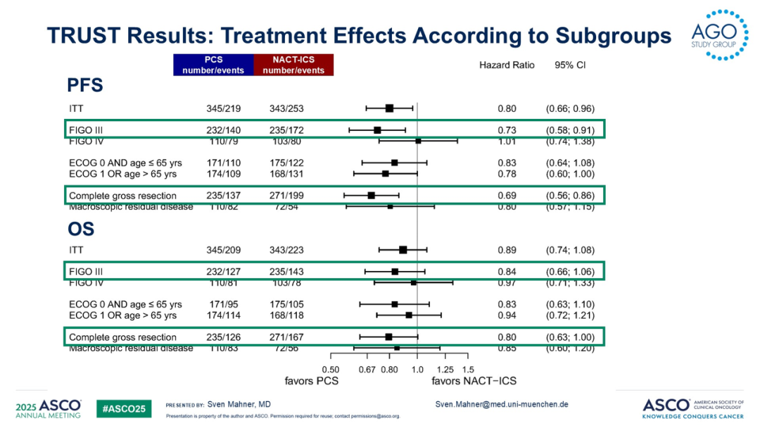 ☆在亚组分析中,在PCS后达到R0切除的患者预后最佳。PCS组的R0患者无论PFS(HR=0.69,95%CI[0.56,0.86];P=0.0009)或者OS(HR=0.80,95%CI[0.63,1.00];P=0.0521)均优于NACT-ICS组的R0患者。在FIGO III期患者中,PCS组的PFS(HR=0.73,95%CI[0.58,0.91];P=0.0005)显著优于NACT-ICS组,而OS有改善趋势(HR=0.84,95%CI[0.66,1.06];P=0.14)。
