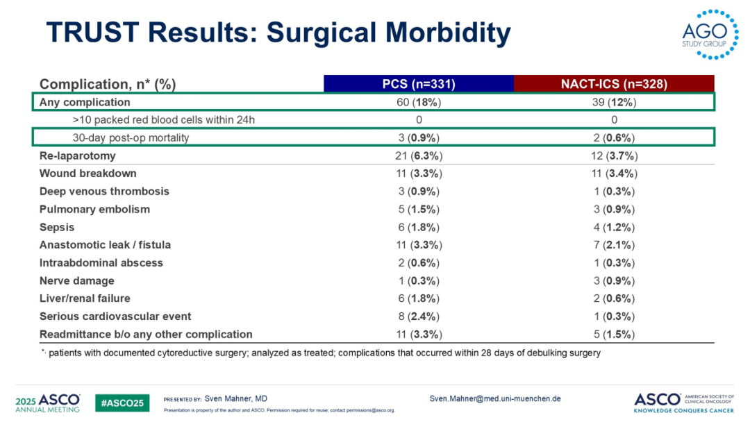 之前,国际上有两个类似的III期临床研究EORTC 55971和CHORUS,其结果均显示晚期卵巢癌患者接受NACT-ICS非劣于PCS。但这两项研究PCS组的R0率分别为19%和17%,且术后30天患者死亡率分别为2.5%和5.6%,使得学术界对其手术质量产生怀疑。与之对比,TRUST研究中的PCS组R0切除率为68%,远高于EORTC 55971和CHORUS研究,且术后30天患者死亡率为0.9%,也明显较低。体现了参与中心严格手术质控的价值。TRUST研究通过严格的中心选择与手术质控,显著提高了R0切除率与术后安全性,揭示了PCS的真实疗效评价。