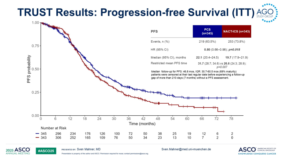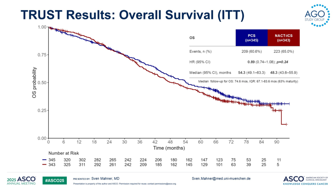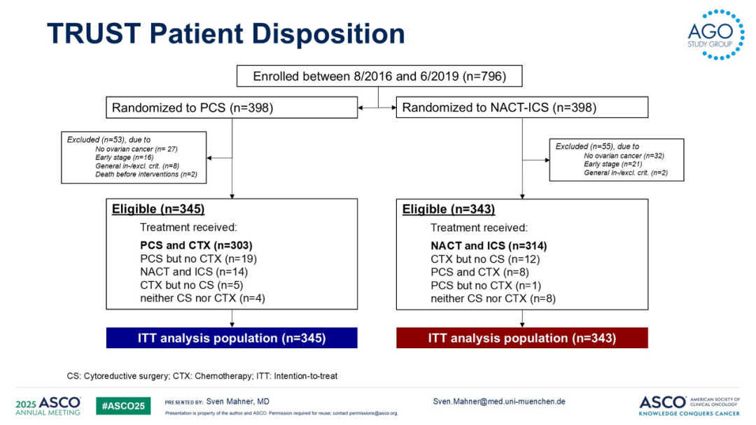 TRUST研究的参与中心需保证能通过现场手术质量审核,并且需具备良好的基础设施条件。研究者的手术质控标准包括每年至少完成36例晚期卵巢癌的PCS,且R0切除率需达50%或以上。797例FIGO IIIB-IVB期且体能状态良好(ECOG评分0/1)的卵巢癌、输卵管癌或腹膜癌患者随机分配至以下两组,1)PCS组:患者接受PCS后行6个周期化疗;2)NACT-ICS组:3个周期NACT后接ICS,术后再完成3个周期化疗。两组均允许使用贝伐珠单抗和/或PARP抑制剂的维持治疗。688例可评估患者,中位年龄63岁(32-83岁),其中345例接受了PCS,343例接受了NACT-ICS。92%的患者为高级别浆液性癌。根据研究中心、年龄和ECOG体能状态评分对患者进行分层。