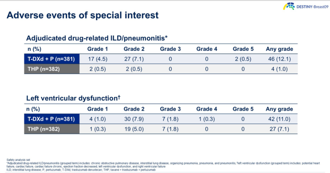 两组之间在间质性肺病(ILD)方面也存在差异,ILD是与T-DXd相关的一种特别受关注的不良事件。经判定的药物相关ILD在接受T-DXd联合帕妥珠单抗的患者中发生率为12.1%,而在接受THP的患者中为1.0%。尽管T-DXd组中的大多数ILD事件为1级或2级程度,但仍有2名患者因ILD死亡。
