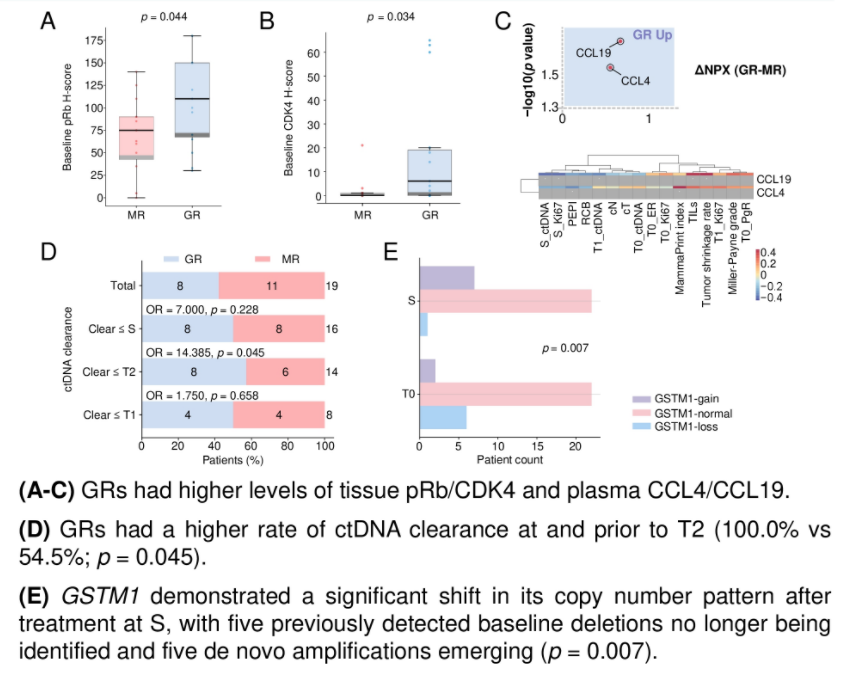 在生物标志物方面,GRs在T2及之前ctDNA清除率更高(100.0%vs 54.5%;P=0.045),血浆CCL4(P=0.029)和CCL19(P=0.020)水平更高,免疫组织化学pRb(P=0.044)和CDK4(P=0.034)表达水平也更高。