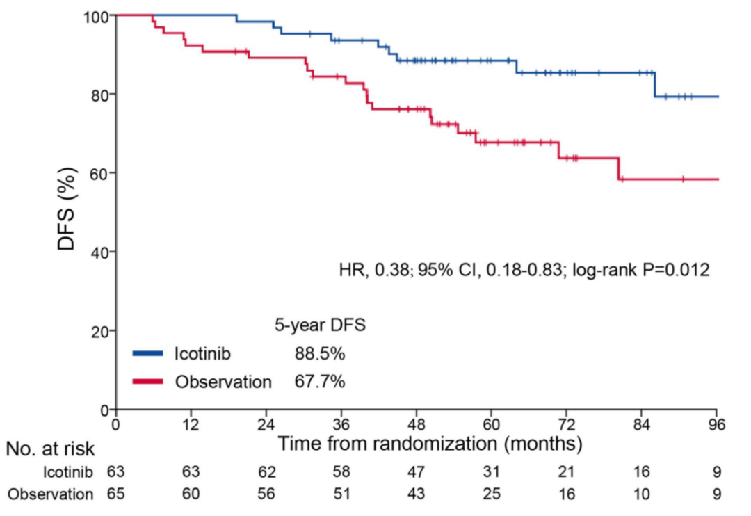 中位随访65.0个月显示,埃克替尼组vs观察组的5年DFS率为88.5%vs 67.7%,(log-rank P=0.012,HR=0.38;95%CI:0.18-0.83),埃克替尼降低了62%的疾病进展或死亡风险,首次证实了第一代EGFR-TKI在IB期NSCLC患者中的长期获益。