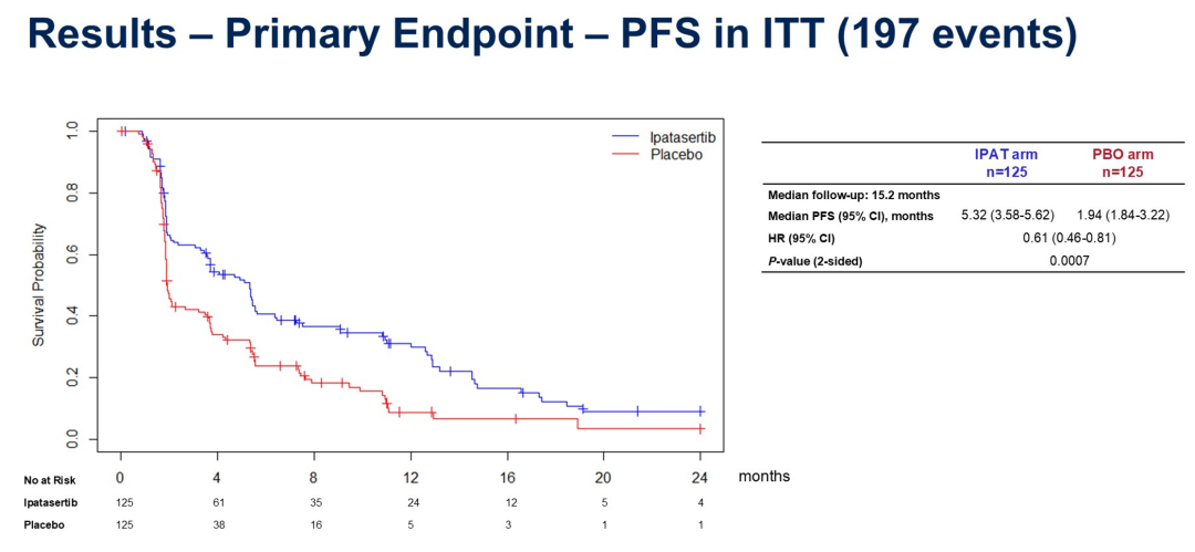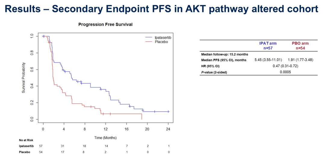 以往报道CAPItello-291研究中的卡匹色替,以及此次ASCO会议报道的FINER研究中的ipatasertib,都属于新型AKT抑制剂。CAPItello-291研究既往报道的结果已经证实,卡匹色替在全人群以及PAM通路变异患者中均显示良好的PFS改善。FINER研究设计与其大致相似,但使用ctDNA进行靶点检测。结果显示在ITT人群(PFS:5.32 vs 1.94个月,HR 0.61,P=0.0007)和AKT通路变异(5.45 vs 1.91个月,HR 0.47,P=0.0005)患者中,也得到了一致的PFS获益。
