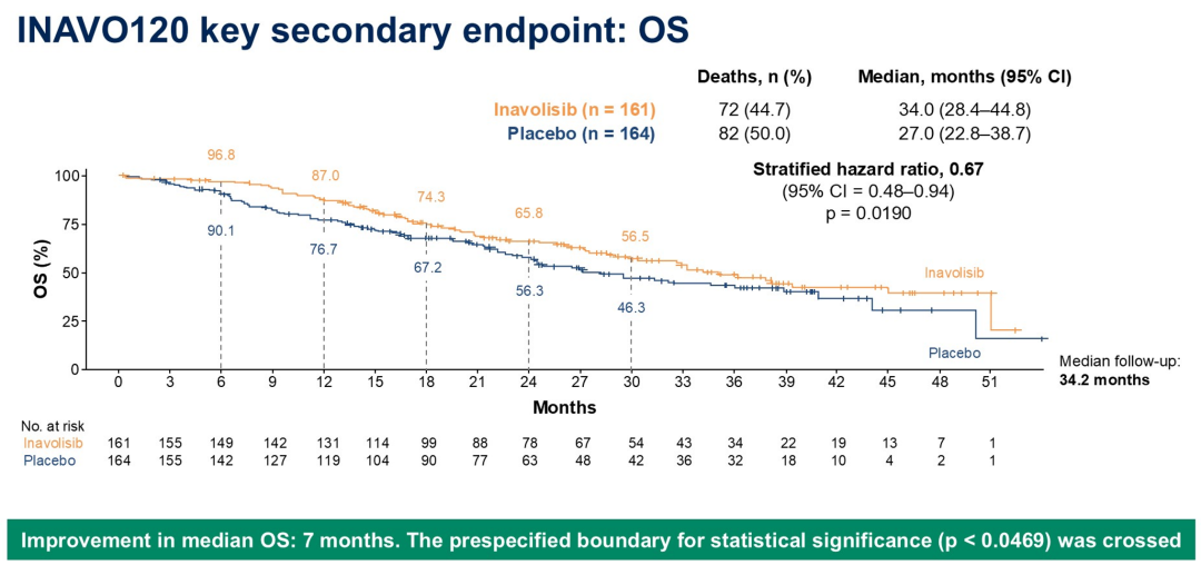 该研究入组了携带PIK3CA突变且既往辅助ET快速进展(辅助内分泌治疗中或完成后<12个月)的HR+/HER2-晚期乳腺癌患者。去年发表于NEJM的结果显示,在CDK4/6i+ET基础上联合伊那利塞,能够使PFS(15.5 vs 7.3个月;HR 0.43;P<0.0001)和ORR(58.4%vs 25.0%)都得到翻倍改善。这次ASCO大会报道更新的PFS依然保持显著获益(17.2 vs 7.3个月,HR 0.42),而且报道的OS结果显示伊那利塞达到了34个月,相较于对照组(27个月)具有显著统计学意义和临床意义的改善(HR 0.67,P=0.019)。