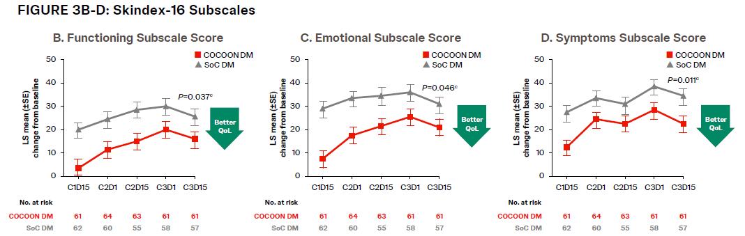 在此次公布的PROs结果中,观察到在C3D15,相较于标准方案,COCOON皮肤加强管理方案全面降低了皮肤AE对患者生活质量的影响,包括机体功能、情绪和体征状态。