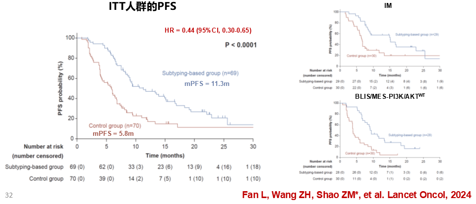 此外,由邵志敏教授领衔的FUTURE-SUPER等系列研究进一步验证了“复旦分型”的临床价值。FUTURE-SUPER研究结果显示,基于亚型的精准治疗较标准治疗在转移性TNBC患者的一线治疗中显著改善了患者中位PFS(11.3个月vs 5.8个月,HR=0.44,P<0.0001)。并且TNBC患者的治疗方案不在局限于化疗,相关研究进一步强调了使用基于分子亚型进行治疗优化的潜在临床获益,为三阴性乳腺癌这一难治亚型的精准治疗开辟了新路径。