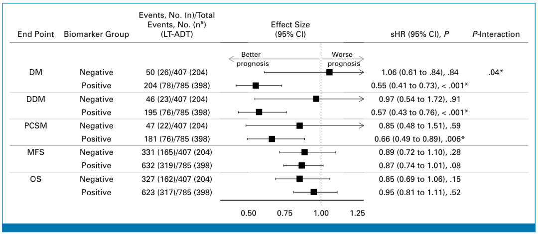 在完整的验证队列中,66%(785名患者)的MMAI生物标志物呈阳性;在这些患者中,与短期ADT治疗相比,长期ADT治疗显著降低了远处转移的发生率(HR 0.55;P<0.001)。在生物标志物阴性的男性(407名患者)中,未观察到此类获益(HR 1.06;P=0.84)。