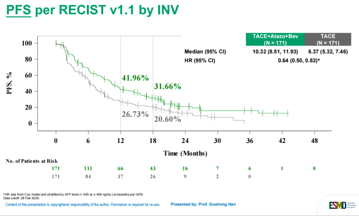 结果显示,TALENTACE研究达到了主要终点:联合治疗组的中位TACE-PFS显著优于单独TACE组,分别为11.30个月和7.03个月(HR=0.71,95%CI:0.55-0.92,P=0.009,图2),OS数据尚未完全成熟。此外,根据RECIST v1.1标准评估的PFS也显示出有临床意义的改善,联合治疗组的中位PFS为10.32个月,而单独TACE组为6.37个月(HR=0.64,95%CI:0.50-0.82,图3)。