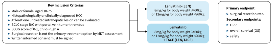 仑伐替尼的特点是其客观缓解率(ORR)相比第一代TKI索拉非尼高很多。介入治疗的主要原理是堵塞肿瘤血管,造成缺氧,从而减缓肿瘤细胞增殖,且缺氧同时会产生大量血管内皮生长因子(VEGF),这是一种强促肿瘤血管生成的细胞因子。介入治疗可能导致肿瘤血管更加丰富,此时联合抑制VEGFR的药物,则可以产生协同作用。基于此,我们开展了这项前瞻性的双臂II期临床研究,以观察该治疗方案的安全性和有效性。