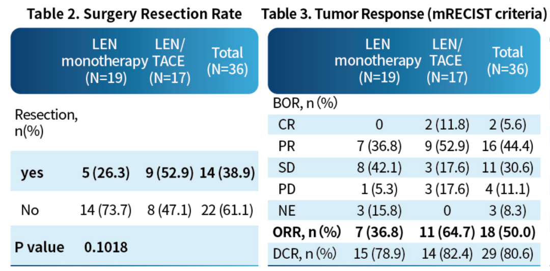 △LEN组和LEN/TACE组的手术切除率和肿瘤缓解率(mRECIST标准)(图源:原文壁报)