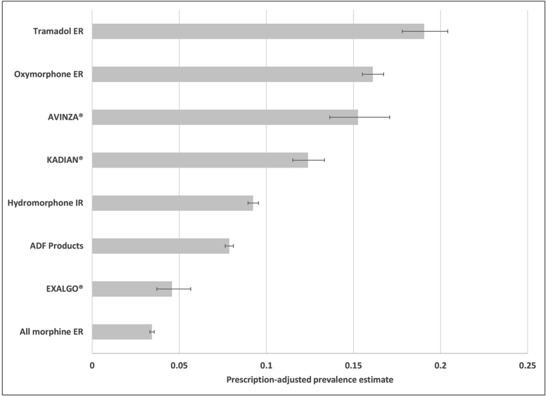 图4 OROS氢吗啡酮缓释片与其他阿片类药物在非口服途径(如咀嚼、直肠给药等)滥用比例的比较