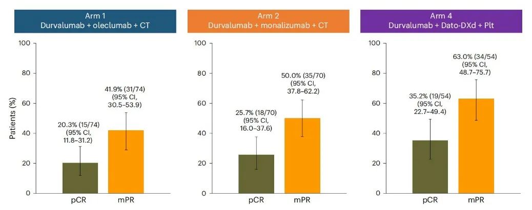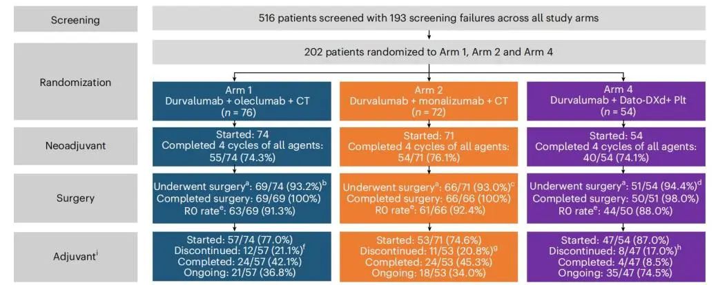 研究中,队列1接受新辅助度伐利尤单抗联合化疗联合Oleclumab随后接受手术,术后给予辅助度伐利尤单抗联合Oleclumab治疗;队列2接受新辅助度伐利尤单抗联合含铂双药治疗联合Monalizumab,随后手术,术后接受度伐利尤单抗联合Monalizumab治疗;队列4接受度伐利尤单抗联合Dato-Dxd以及单药铂类治疗,随后进行手术,患者分期为IIa-IIIb期,不携带驱动基因突变。