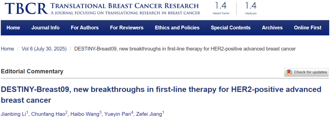2025年7月30日,由DESTINY-Breast09研究中国Leading PI、《TBCR》主编、中国人民解放军总医院江泽飞教授(通讯作者)领衔,中国科学技术大学附属第一医院潘跃银教授、青岛大学附属医院王海波教授、天津市肿瘤医院空港医院郝春芳教授与中国人民解放军总医院李健斌副研究员(第一作者)四位《TBCR》编委会成员共同研讨,针对该研究在《TBCR》(IF 1.4)发表评论文章,指出T-DXd+P方案展现出了卓越疗效,中位无进展生存期(mPFS)达40.7个月,较THP显著降低44%疾病进展或死亡风险,有望重塑HER2阳性乳腺癌的一线治疗格局。在临床实践中,还需注意该方案的不良事件的管理,以期保障患者安全,争取更多获益。
