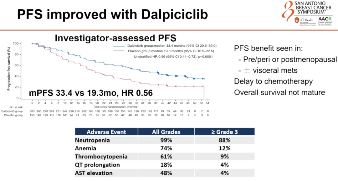 以DAWNA-2研究为例,该研究评估了达尔西利联合来曲唑或阿那曲唑一线治疗HR+/HER2-晚期乳腺癌的疗效。结果显示,达尔西利组的中位PFS达到33.4个月,显著优于安慰剂组的19.3个月,风险比(HR)为0.56,表明达尔西利联合内分泌治疗能将疾病进展风险降低近50%。这一数据的公布为我国自主研发的首款CDK4/6i达尔西利在HR+晚期乳腺癌治疗中的治疗地位提供了有力支持。