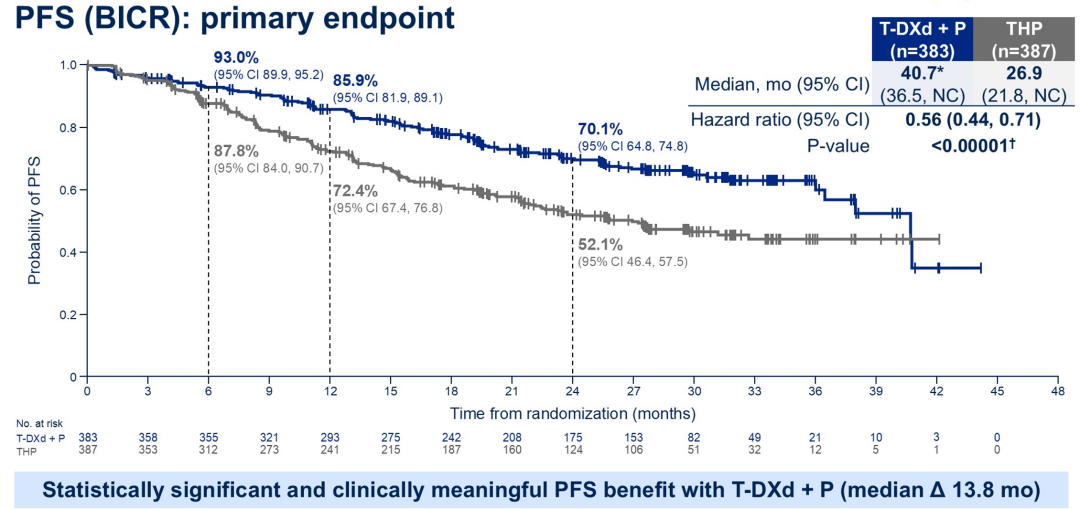 具体而言,在全球数据中,盲态独立中心评估(BICR)意向性治疗人群中,T-DXd+P组患者取得超过40个月的超长中位PFS,相较于传统标准治疗THP(曲妥珠单抗+帕妥珠单抗+紫杉类)组延长13.8个月,疾病进展或死亡风险显著降低44%(40.7 vs 26.9个月,HR 0.56,95%CI:0.44~0.71,P<0.00001),且不同亚组患者显示了一致的倾向于T-DXd+P组的PFS获益趋势。