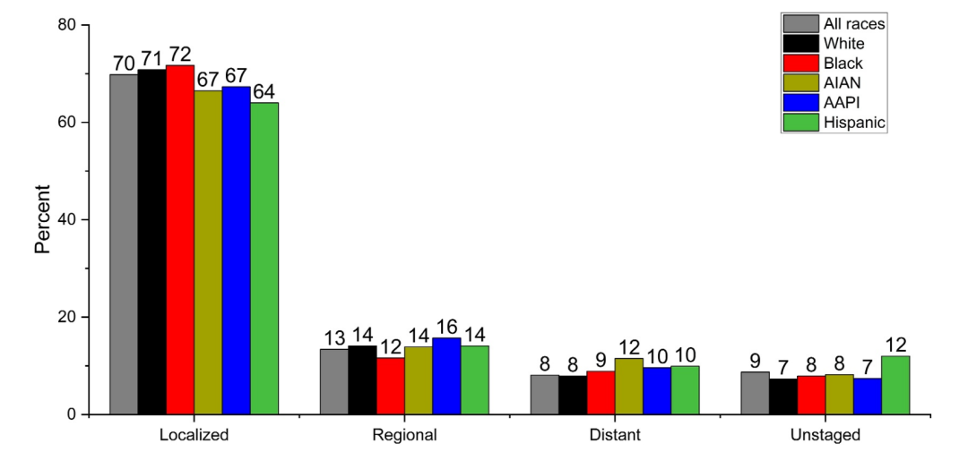 白人男性的生存率最高(99%;图3),亚裔美国人和太平洋岛民(AAPI)和西班牙裔男性的生存率最低(94%),这部分反映了后两者群体中早期诊断比例较低(图4)。AIAN男性最有可能在远处转移阶段被诊断(12%,而白人男性为8%),这可能至少部分反映了与其他男性相比筛查普及率较低。所有被诊断为远处转移疾病的男性,其5年生存率从黑人男性的36%到AAPI男性的43%不等。然而,在这些广义定义的种族群体内部存在很大差异;例如,AAPI各族裔的5年相对生存率从日裔男性的97%到汤加裔男性的58%不等。